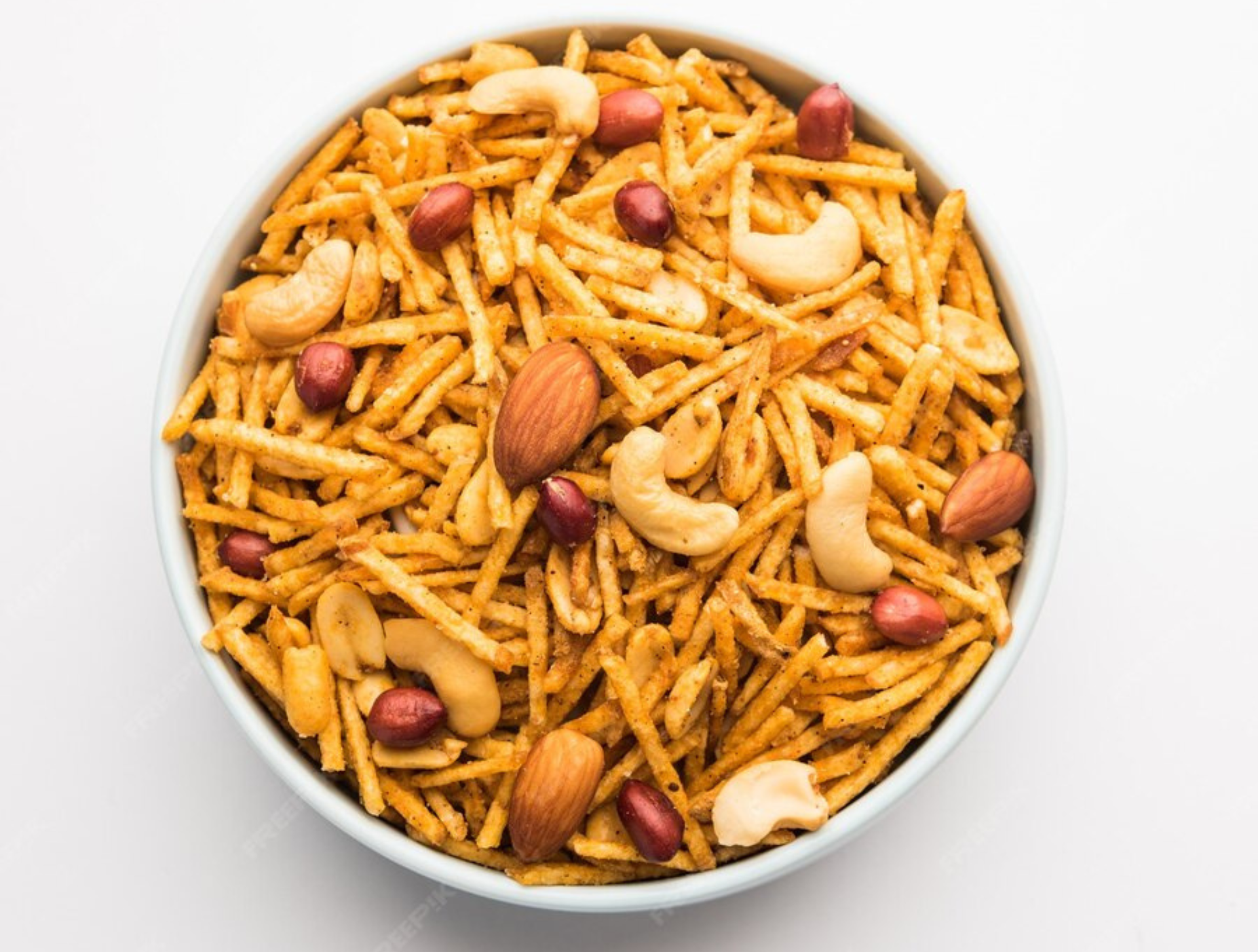 South Indian mixture is made using sev, peanuts, curry leaves, and mild spices, fried and blended for a crunchy snack.